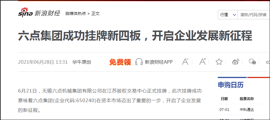 2021年6月21日,無錫六點(diǎn)機(jī)械集團(tuán)有限公司正式掛牌新四板,企業(yè)代碼:681294,吊籃租賃領(lǐng)域掛牌新四板的企業(yè)橫空出世,多家新聞網(wǎng)站競(jìng)相報(bào)道。六點(diǎn)集團(tuán)用6年的時(shí)間,從默默無聞到行業(yè)黑馬,成為了大家關(guān)注的焦點(diǎn),連主流媒體光明網(wǎng)、新浪財(cái)經(jīng)、網(wǎng)易財(cái)經(jīng)等門戶網(wǎng)站也發(fā)文報(bào)道。